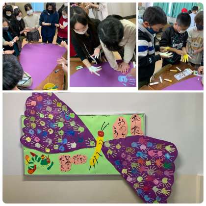 はらぺこあおむしがちょうちょに成長するようすを、小学校生活の成長に見立てて表現しました。