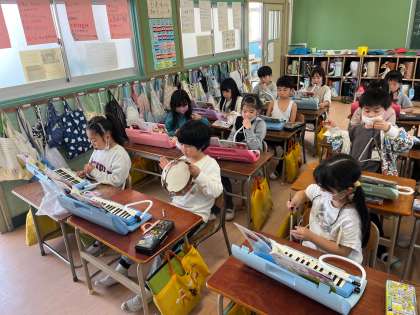 鍵盤ハーモニカ、タンブリン、トライアングル、カスタネット、すずなどパートに分かれて練習し、みんなで合わせました。