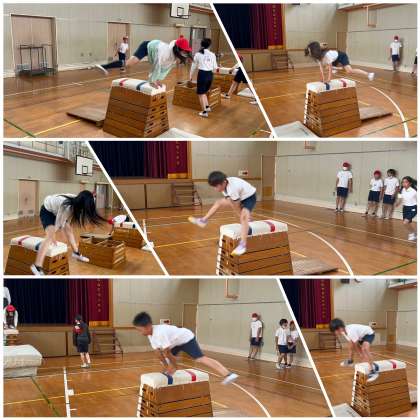 開脚とびをそれぞれの課題に合わせた場所で練習しています。