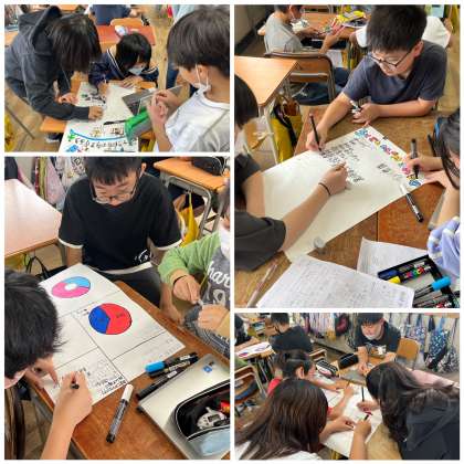 「防災」をテーマに各自で必要なことを調べ、割り付けやキャッチコピーを考えながら作っていっています。
