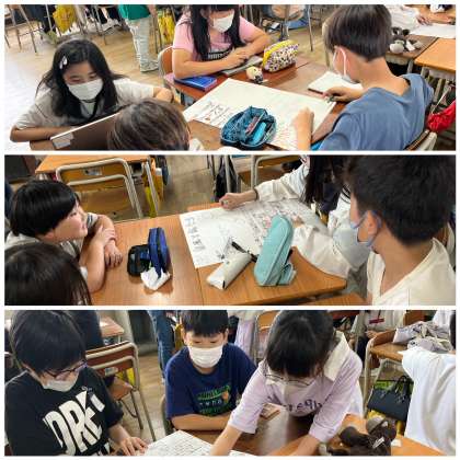 6年生の国語の学習「防災ポスターを作ろう」では班でポスター作りに取り組んでいます。