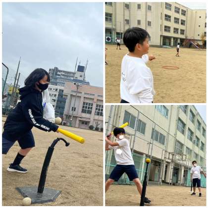 ボールの打ち方や捕り方を練習してから守る位置などを工夫しながら試合をし、2時間目以降は自分たちで審判なども行いながら試合をしていきました。