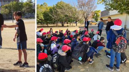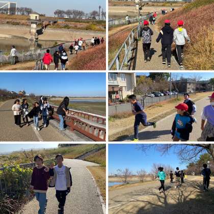 「実は、この公園は、去年学習した『狭山池』の横にあるんです。1350年前に作られた『狭山池』がその土手の向こうにあります。自分のペースでいいから、1350年前の人々がつくった『狭山池』を感じて歩いて来よう!」