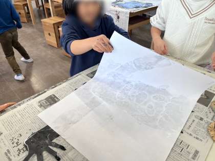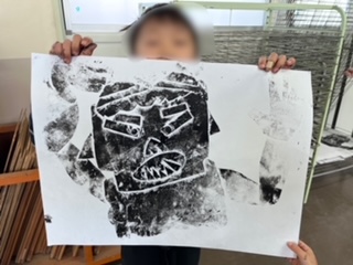手が真っ黒になりながらも一生懸命ローラーを転がし、1人ではできない版画を協力しあう姿に成長を感じた日でした。