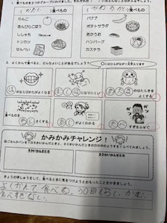 栄養指導でよく噛んで食べることの大切さを学びました。給食の時間には、いつも以上によく噛んで食べようとすることを意識できました!