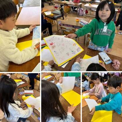 一年生は、自己紹介の学習をするときに、自分の名前を書き、自分の好きなものを絵で表現しました。