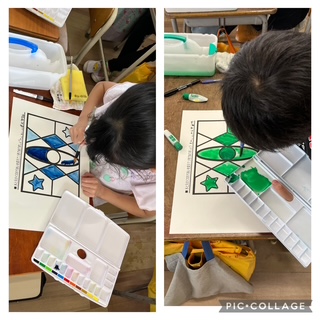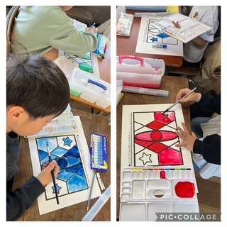 図工の学習では絵の具を1色だけ使って、絵を塗り分ける学習をしました。
