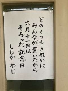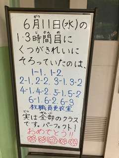 今日は、全てのクラスでくつが靴箱にきれいにそろっていました。きょうは「そろった記念日」です。みんな素晴らしいです。
