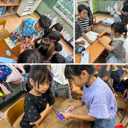 あっという間に、折り紙を抱えた友達が、作り方を教えています。