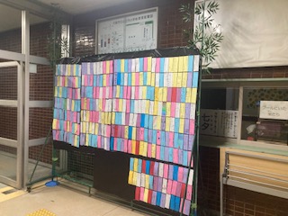 7月7日は七夕です。短冊にそれぞれの願いを書いてます。自分の目標や、家族や友だちの幸せを願う短冊も見られます。みんなの願いが叶うといいですね。