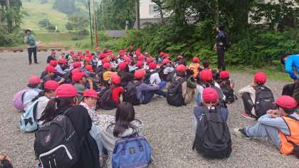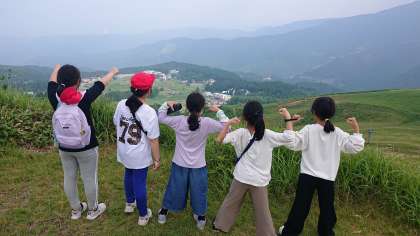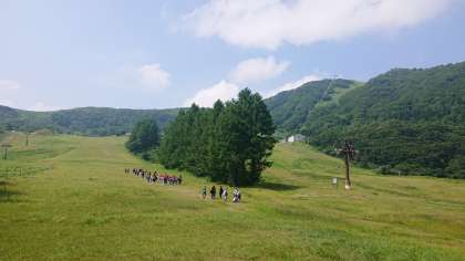 ガイドの方の説明を聞いて、登山に出発しています。コースの中腹で宿舎を下に見ながらの記念撮影です。