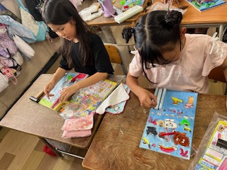 図工では、くぎうちゲームの作品を作っています。絵の具で好きな絵を描いた板に、ビー玉を通る道を考えながらくぎを打っています。