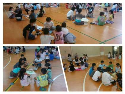 今日の朝の会は読書タイムでしたが、1年生と6年生だけ、講堂に集まり、ペア集会を行いました。