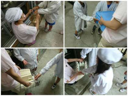 毎日、12時25分になると、給食室で、給食を子どもたちに手渡ししています。