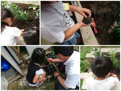 校長先生からひまわりやマリーゴールドの苗を受け取り、ひとつずつ丁寧に植えました。