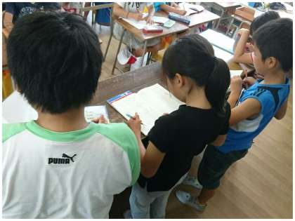 係の子どもが中心になって、みんなで協力して答え合わせをしています。