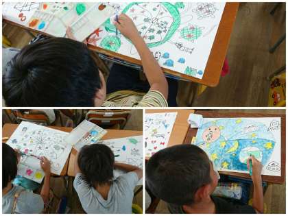 傘から広がる世界を想像しながら絵を描き、色をつけました。