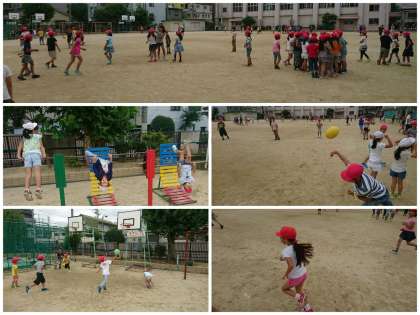 鉄棒で逆上がりの練習をしたり、ドッジボールやバスケットボールをしたり、鬼ごっこをしたりして、暑さに負けず、元気に遊んでいます。