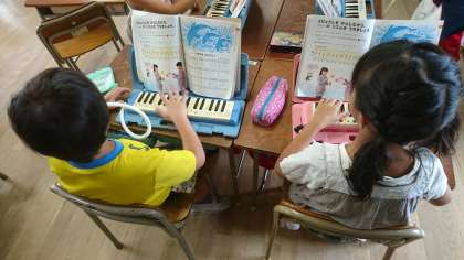 先生の伴奏にあわせて、楽しく鍵盤ハーモニカを演奏しました。