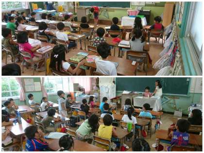児童会メンバーが各教室をまわり、あいさつの仕方や気持ち良さをアピールしました。
