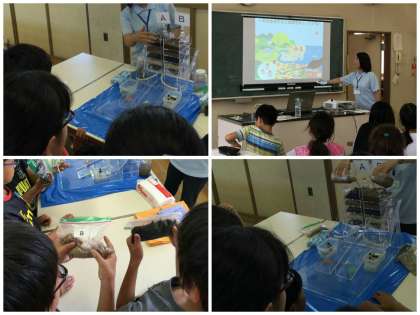 サントリーから講師の先生に来ていただき、自然と水の関わり、水を育む森の大切さについて教えていただきました。