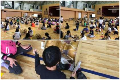 チャンゴという韓国の楽器を体験し、最後は建国小学校の四年生たちの迫力のある演奏の発表を聴くことができました。
