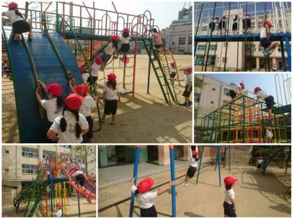 初めて小学校のコンビネーション遊具やジャングルジムなどを使いました。