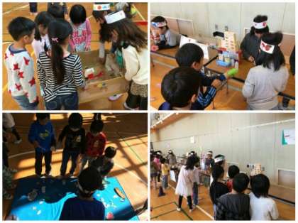 2年生が生活科で作った手作りおもちゃが並ぶ「おもちゃランド」に、1年生が遊びに来てくれました。