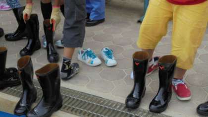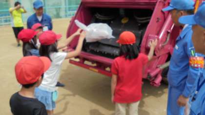 5月19日(月)、2・3限にパッカー車体験を行いました。2限は運動場で仕事着やごみ回収の歴史、そして実際にパッカー車にごみを入れる体験をしました。3限は多目的室でお話を聞きました。最後の写真は安全靴です。