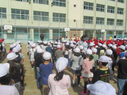 今日の児童朝会は、委員会の委員長さんの自己紹介でした。