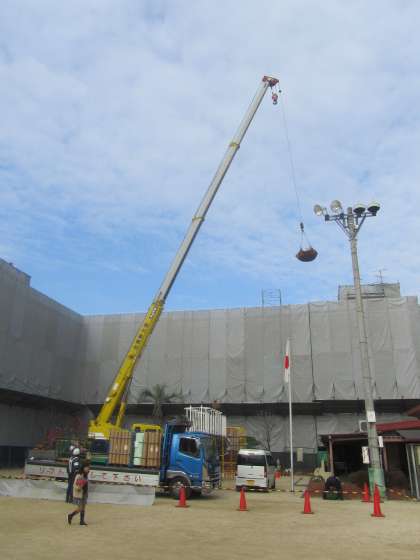 今日は、物資をクレーン車で屋上まで運んでいました。