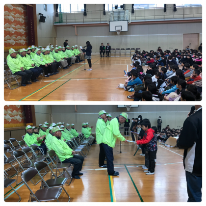 雨の日も風の日も寒い日も暑い日も、毎日、見守りをしていただいている山小なかよし見守り隊のみなさんへ感謝の気持ちを込めて、お礼の言葉とプレゼントを渡しました。