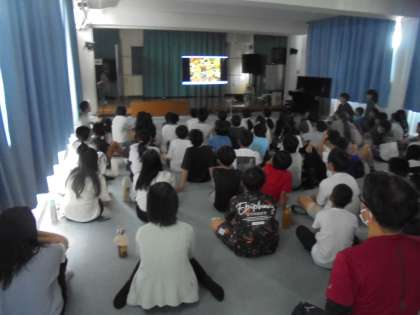 6年生全体で、多目的室で平和についてのビデオをみています。