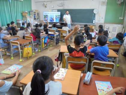 アレックス先生の夏休みについてのクイズにみんなが楽しく答えています。