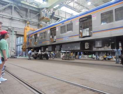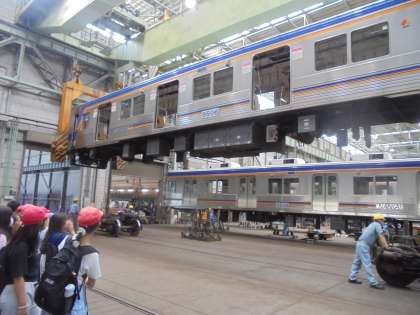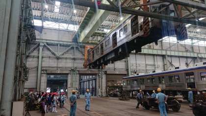 想像よりもずっと高く吊り上げられ、他の車両の上を通って工場の奥へ移動していく様子を見ることができました。