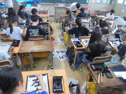 よい姿勢で筆を持ち、字の形や、とめ、はらいに気をつけて、集中して書いています。