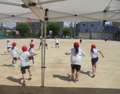 運動場で、短時間だけ元気よく鬼ごっこをした後に、