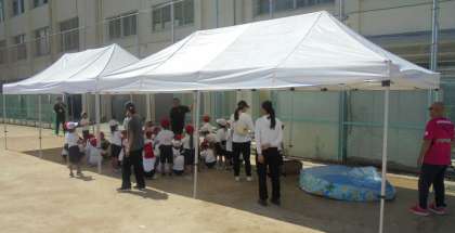 テントの日陰に入ったり、プールの水を触ったり、ホースのミストシャワーにかかったり、冷房の効いた部屋に入ったり、