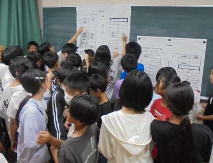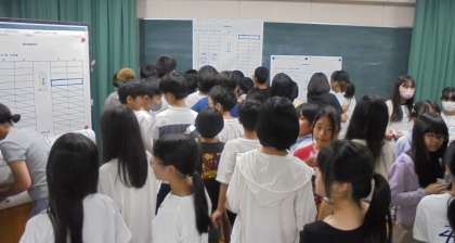 6年生が学年全体で、修学旅行での新幹線の座席を決めています。
