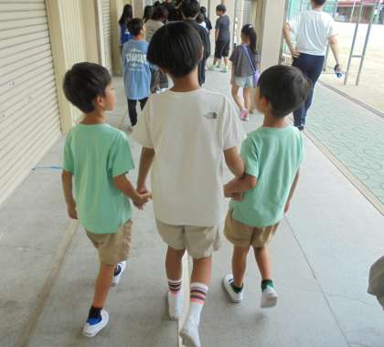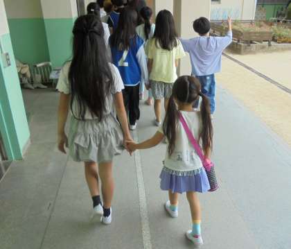 児童集会の後、5年生や6年生と1年生が手をつないで教室に帰っています。