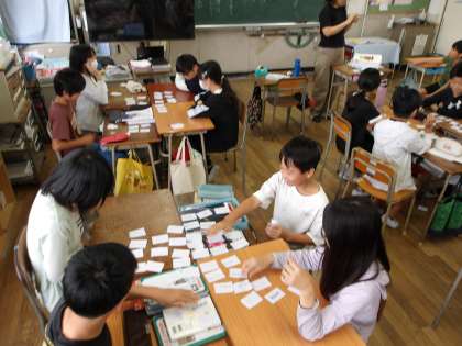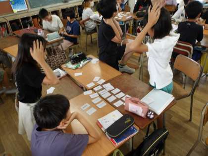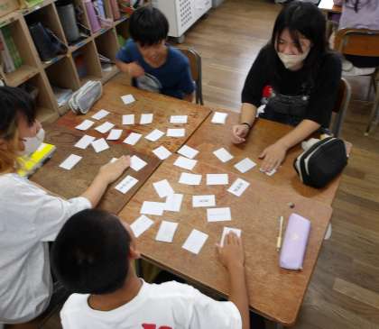 6年生が国語の「複合語」で学習した言葉で作ったカルタで、カルタ大会をしています。