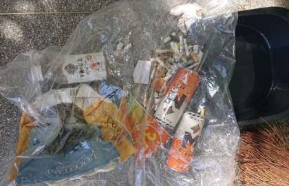 毎朝、学校の給食室から運動場側の道路の掃除をしていますが、結構な量のゴミやたばこの吸い殻が落ちています。写真は1週間分のゴミです。