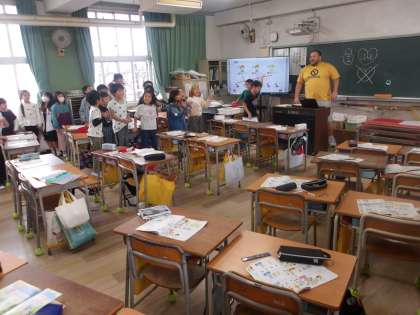 3年生は国語活動で、アレックス先生の英語の表現を聞いて学習して教室の右側か左側に移動しています。とても楽しそうに活動しています。