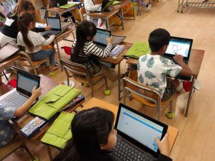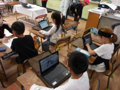 1年生が、国語で学習した漢字を、学習者用端末のタッチパネルで書いて確認しています。