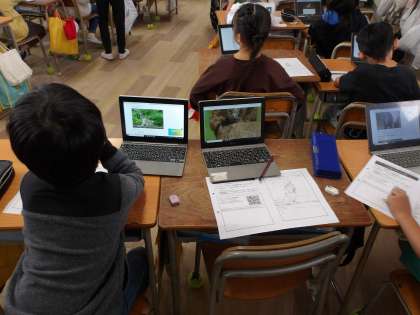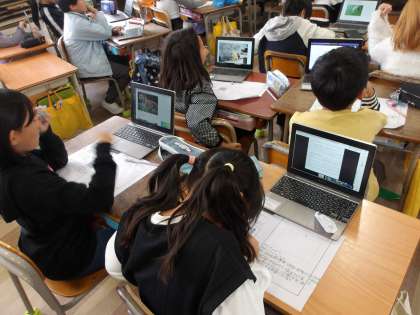 3年生が、「総合的読解力」の学習で、学習者用端末で調べた画像を参考にして資料を作成しています。