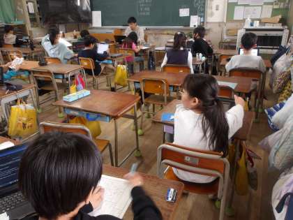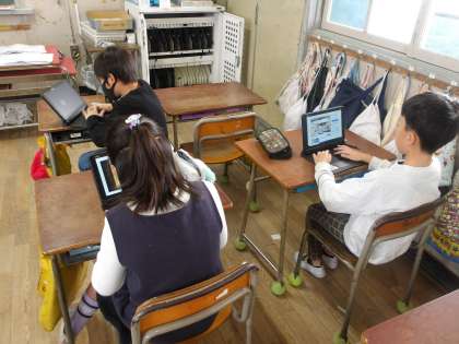 4年生が、1時間目に、算数のプリントをしたり、学習者用端末のアプリでキーボードのタイピングをしたりしています。
