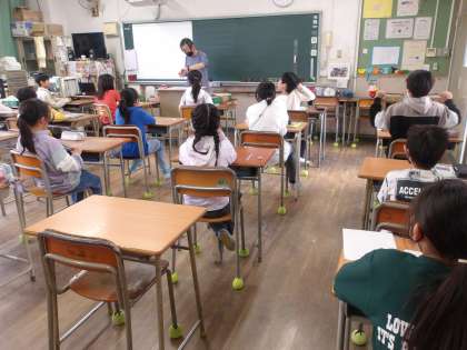 4年生が、1時間目に分割教室で、算数の面積のテストの説明を聞いています。