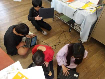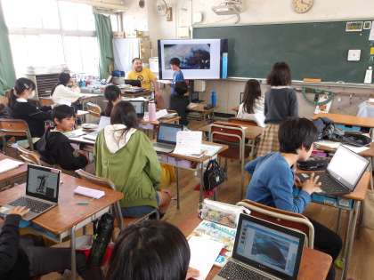6年生が英語の学習で、一人一人が学習用端末で英語の動物のクイズを作っています。