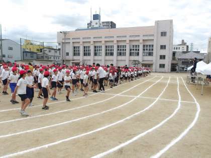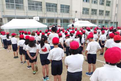 1時間目、運動場で全員が集まって開会式と閉会式の練習をしました。