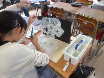 彫刻刀で彫った木の板に絵の具をぬって、黒い画用紙に刷っています。